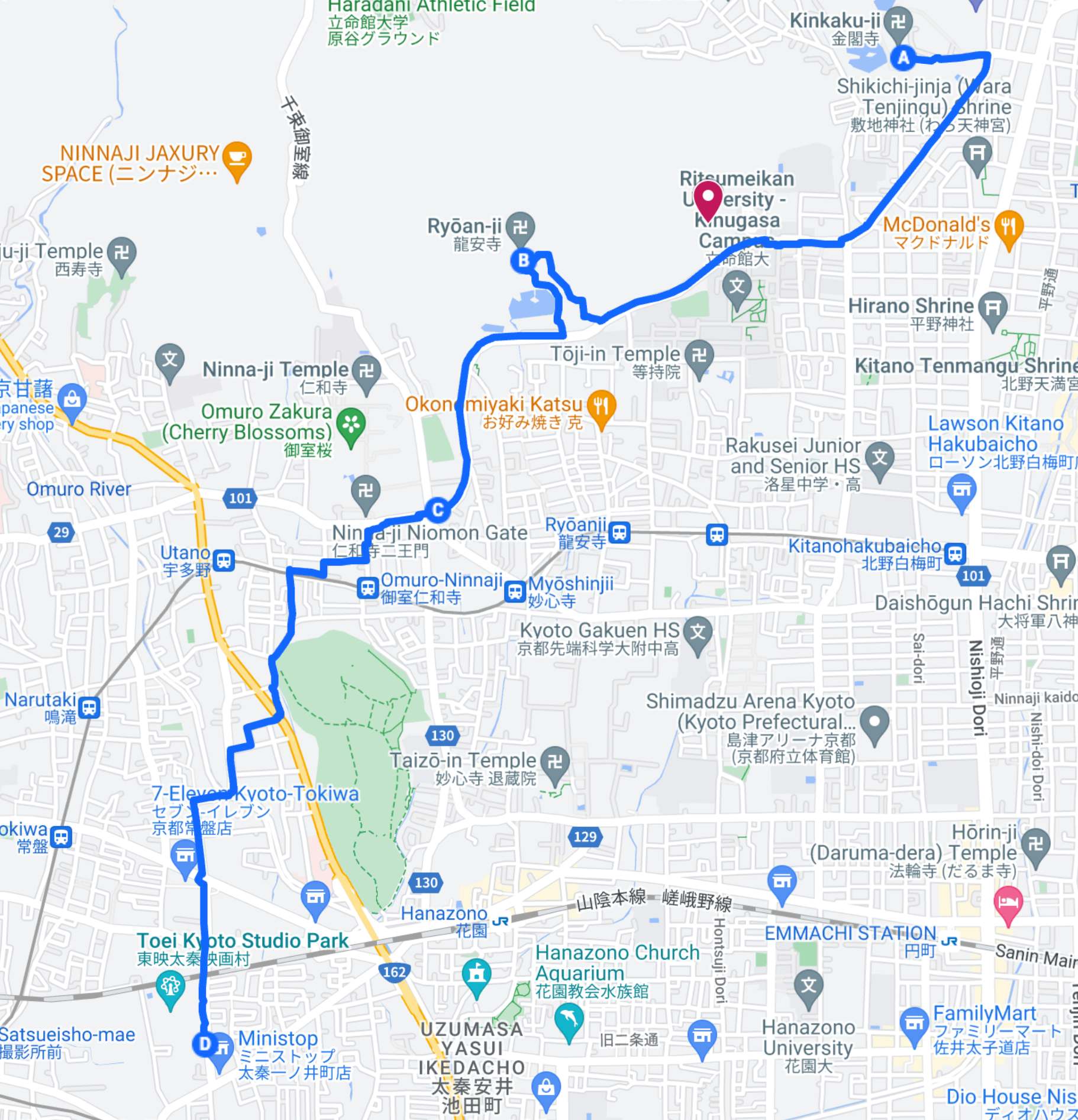Kinkakuji, Ryoanji, and Ninna-ji are three renowned temples registered as “World Heritage Sites,” making them a golden route for sightseeing in Kyoto’s temples and shrines. Lastly, there’s the Toei Uzumasa Eigamura, an experiential theme park where visitors can enjoy attractions such as ninja experiences and transformation experiences, as well as events featuring Movie animation characters. For each temple, you’d want to allocate between 30 minutes to 1 hour, and for Toei Uzumasa Eigamura (Toei Kyoto Studio Park), it’s recommended to set aside at least 2 hours.